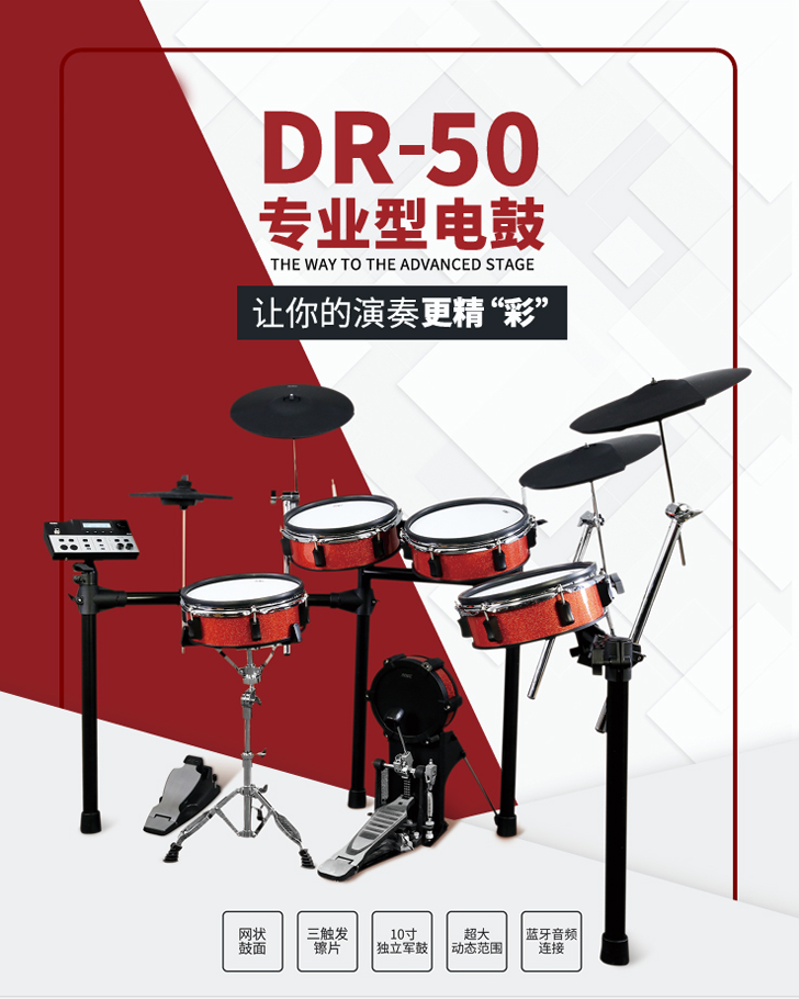 · 轻松实现各种位置与高度调整 · 全网状鼓面,10寸通鼓,三面吊镲,“叮叮镲“支持三触发